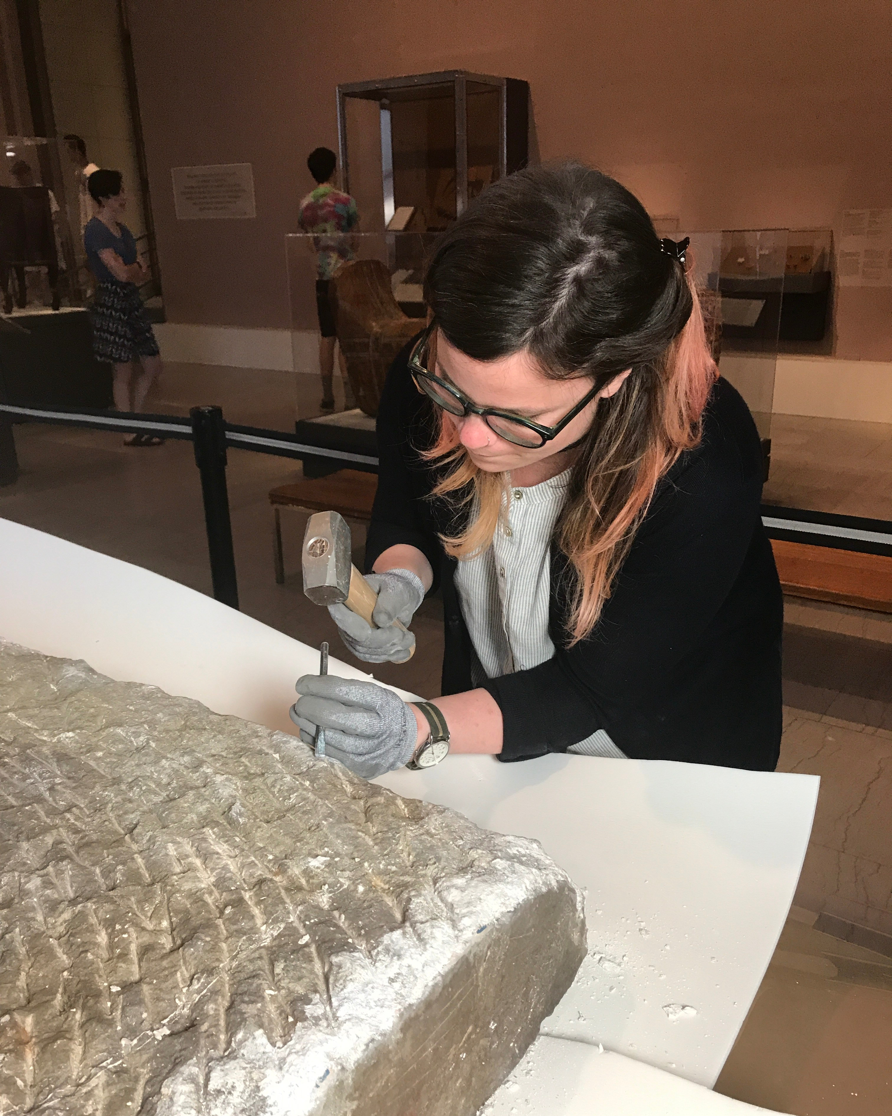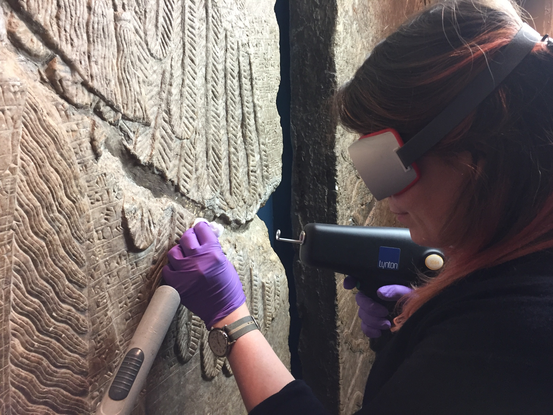 Cleaning of ancient Assyrian alabaster reliefs in the gallery while speaking with museum guests about the work and the field of conservation.