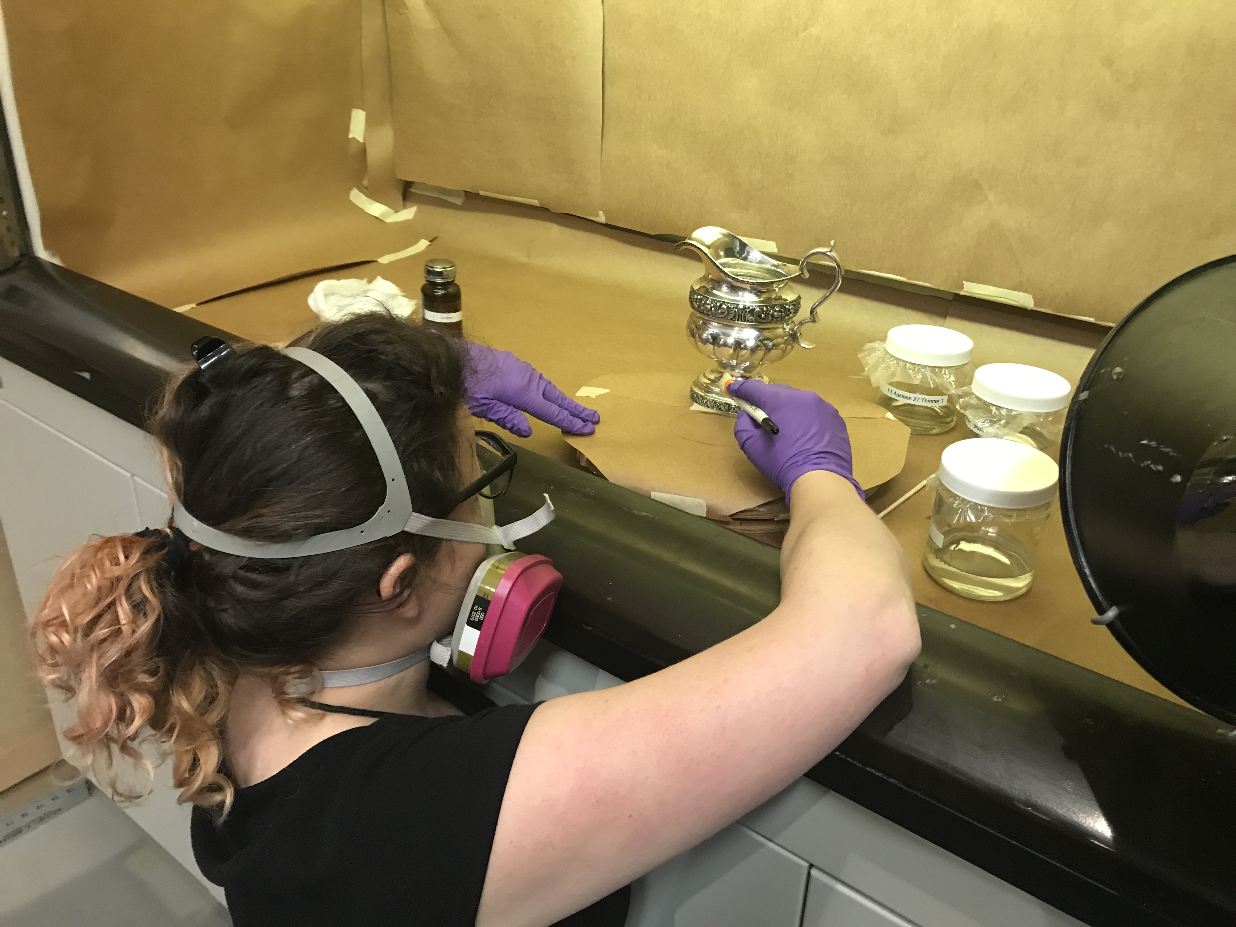 Polishing silver and brush lacquering with Agateen (cellulose nitrate) in preparation for a loan