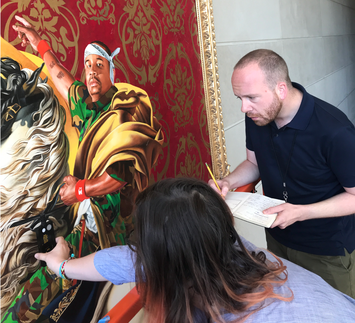 Taking light measurements on Kehinde Wiley’s portrait, “Napoleon Leading the Army Over the Alps” 2005