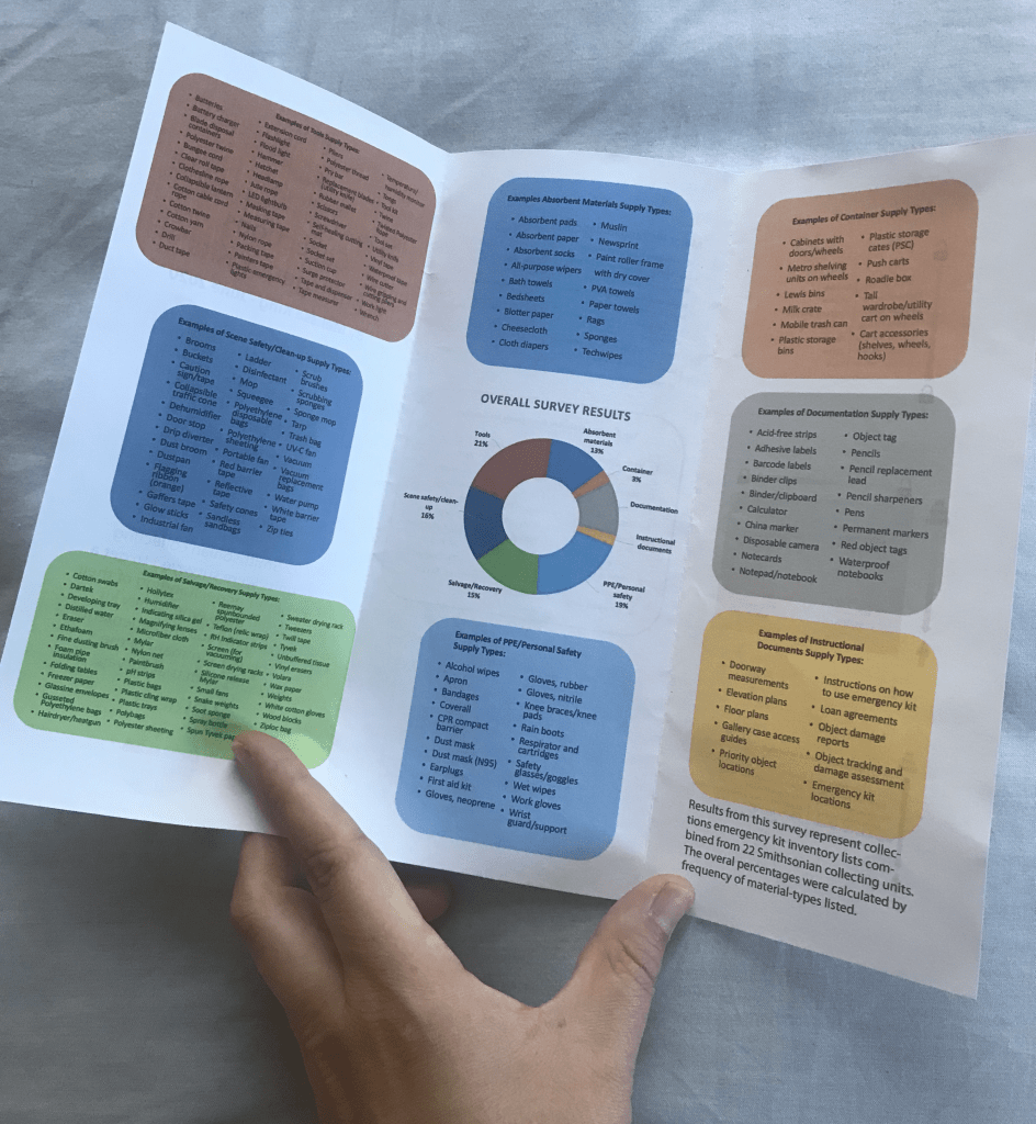 As part of the PRICE Logistics Action Team, Melissa designed and implemented a pan-institutional survey at the Smithsonian of emergency kits designated for collection emergencies. There were several goals for the survey: