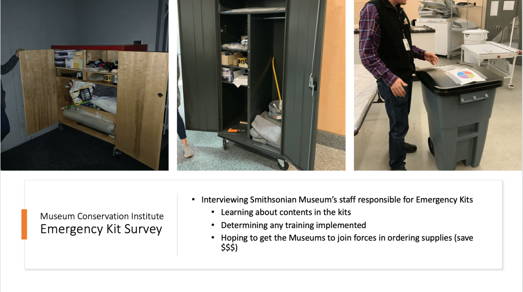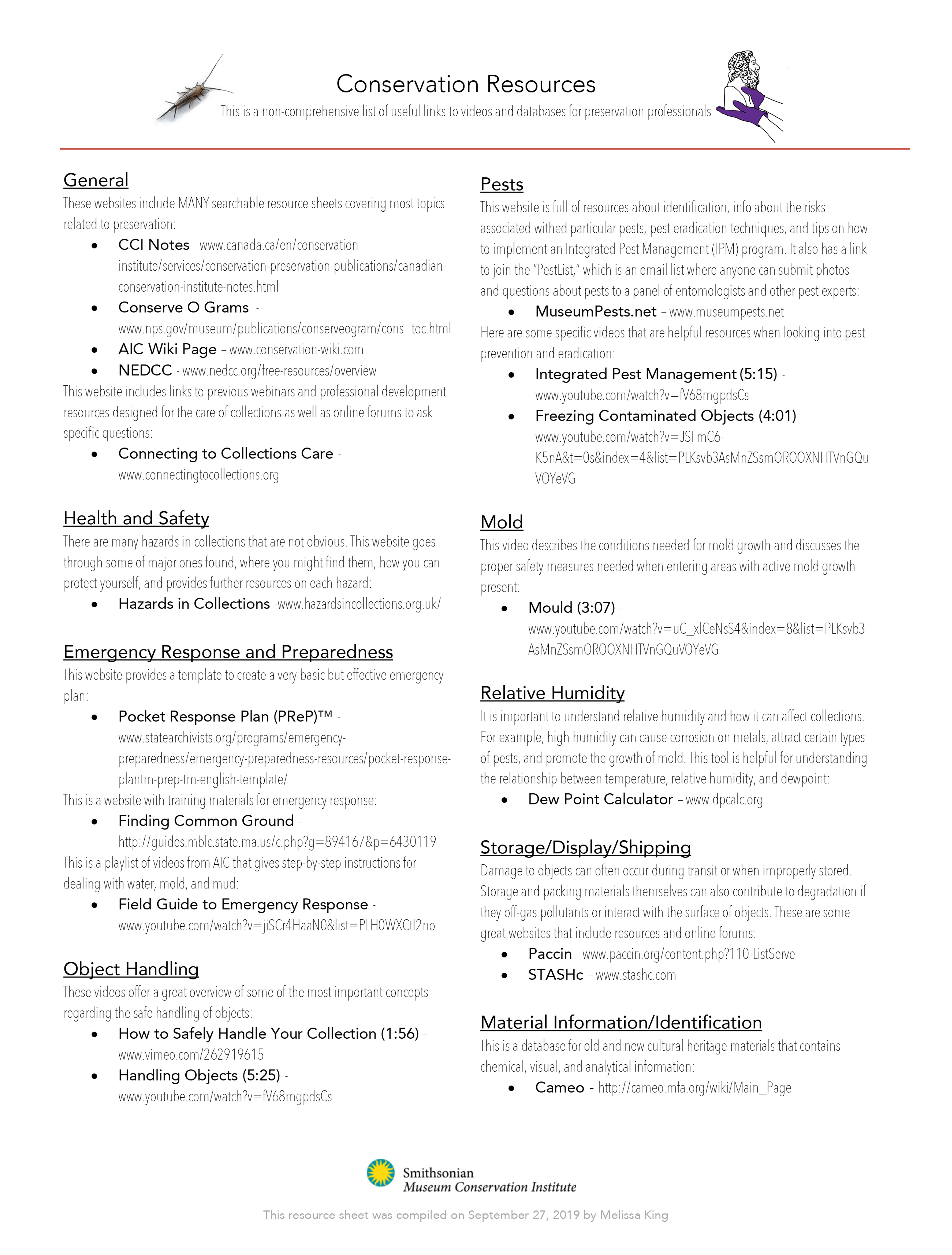 At the start of her internship, Melissa assisted her supervisor, Becky, by compiling a resource sheet for collections professionals in Uzbekistan. Becky was traveling there for work to consult on preventive conservation and wanted the opportunity to share useful resources. Melissa knew that language might be a barrier, so she focused on resources that were not too heavy on reading and ones that provided useful visuals such as videos.