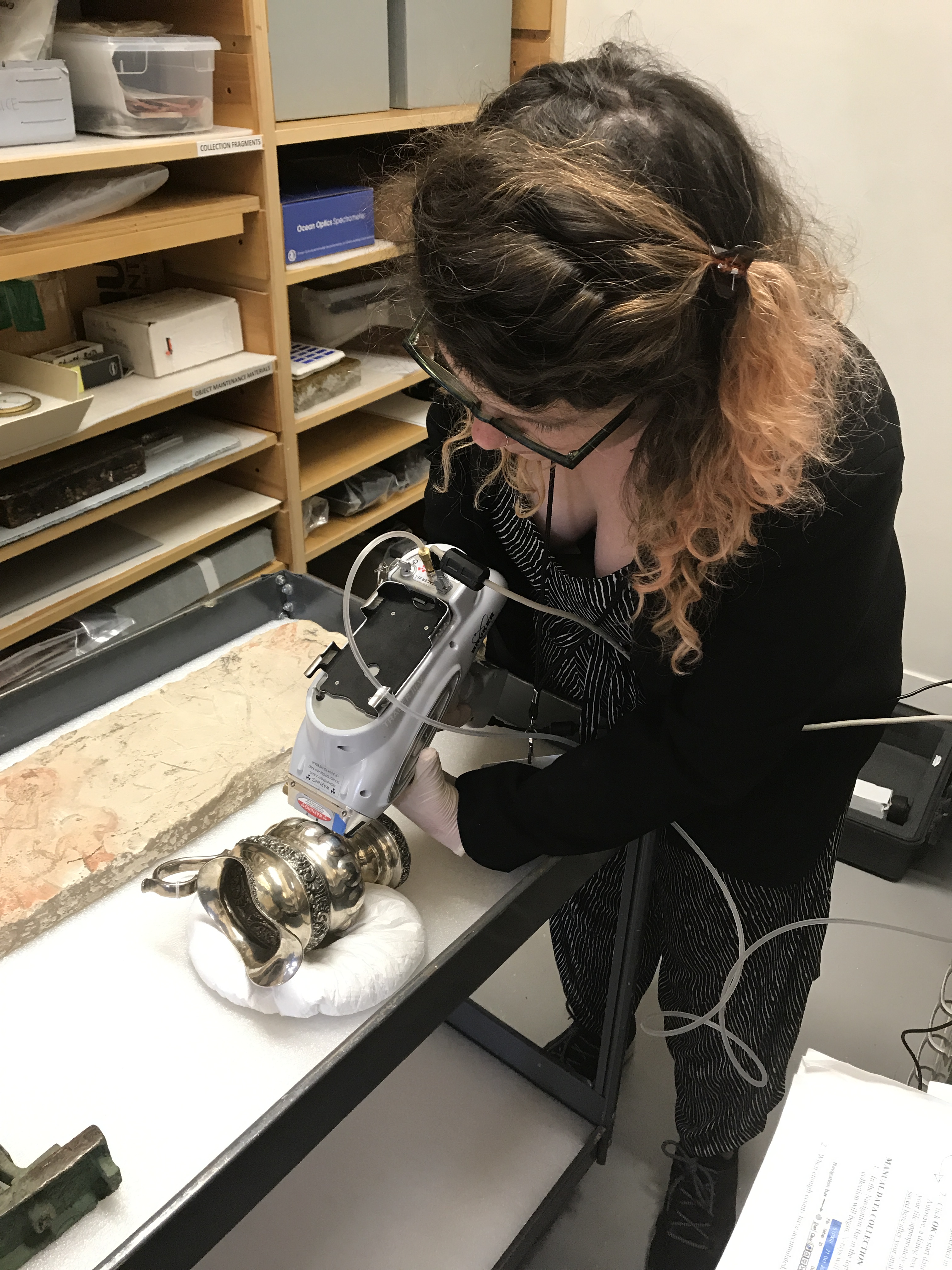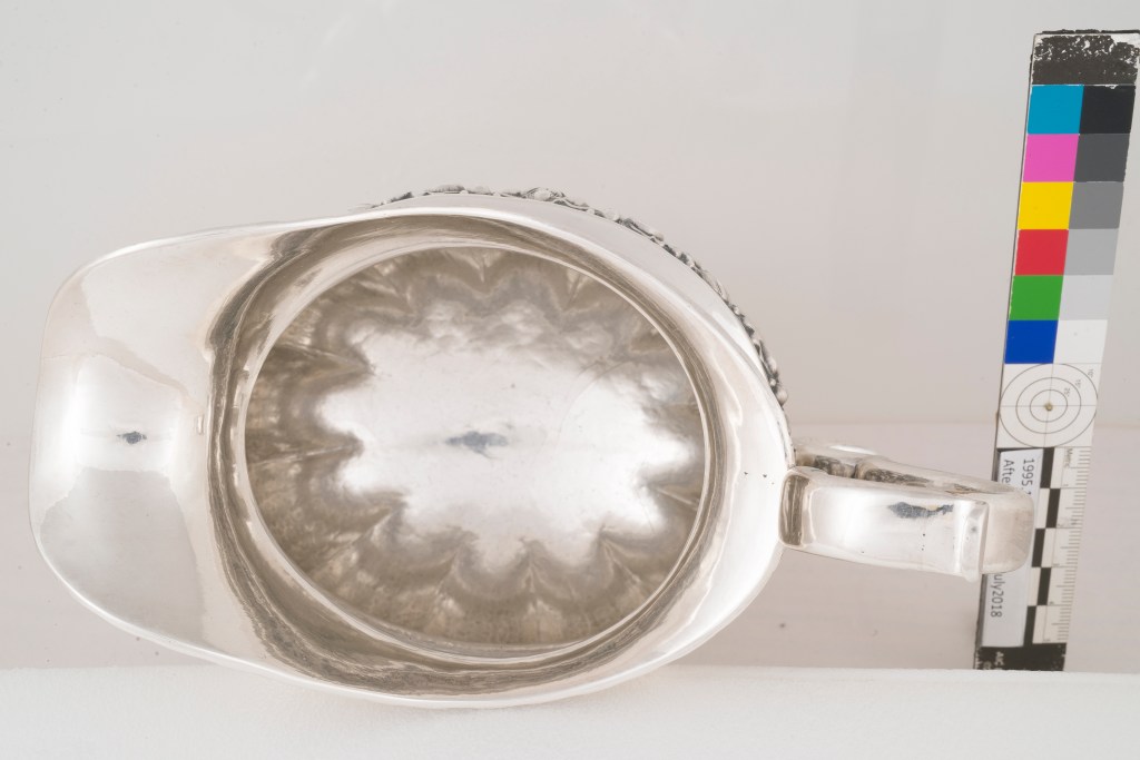 X-ray fluorescence spectroscopy readings were taken with a Bruker-Tracer III-V+ instrument with a rhodium source, beryllium sample window roughly 3mm x 4mm in size, and a Si-Pin detector. Readings were done on the handle and on a center lobe on the proper left side (with the spout as the front). The results yielded both a strong presence of silver and copper. This may confirm that the object is indeed plated, or the copper might indicate a sterling silver. (40 kV, 2.0 mA, 10 sec with a vacuum) X-ray fluorescence was also performed on the center of the handle with nearly identical results as the other reading.