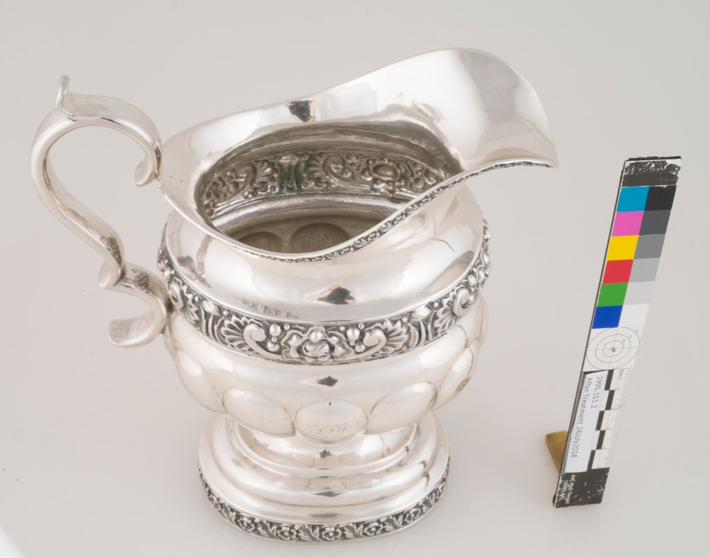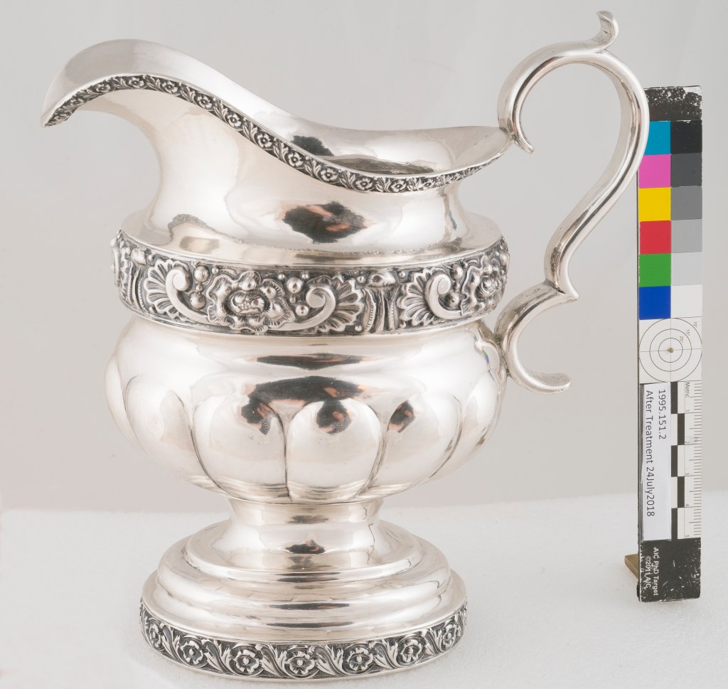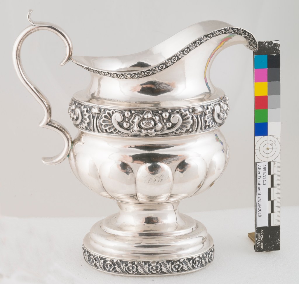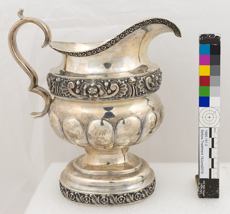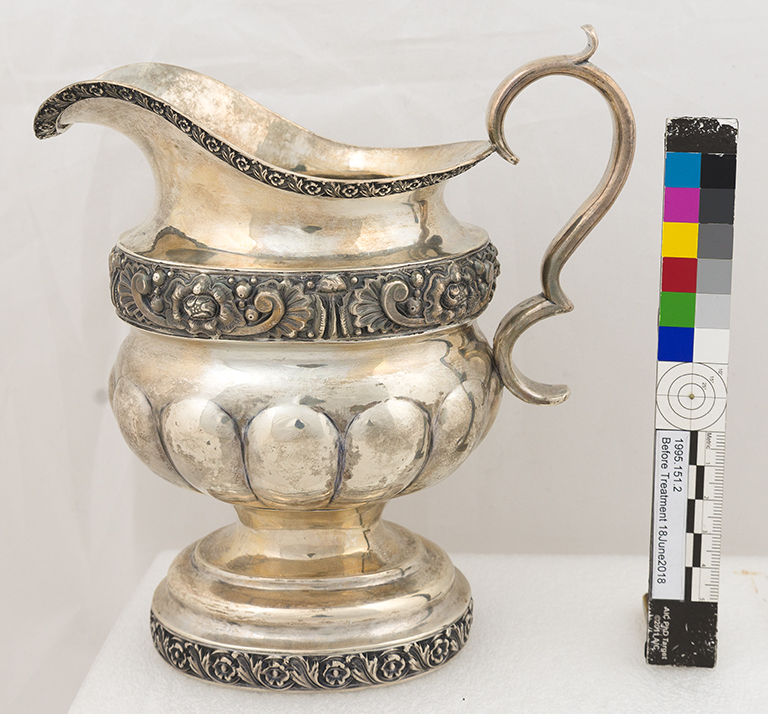 The object is fair and stable condition. There are small dents on the lobes on the body of the object, with the most notable indentations on the three lobes underneath the spout. There is an overall distribution of silver sulfide tarnish that ranges from a dark black to an iridescent coloring. There is a fingerprint induced tarnish stain on a lobe on the body underneath the spout. There are some minor scratches throughout the object and polish residue within some of the recesses. There is some green corrosion product along the underside and interior of the base visible along the join between the base and the body and also along the join between the bottom lip and the stepped portion of the base. This may signify the use of a silver copper hard solder (Metals and Corrosion: A Handbook for the Conservation Professional, p.56).