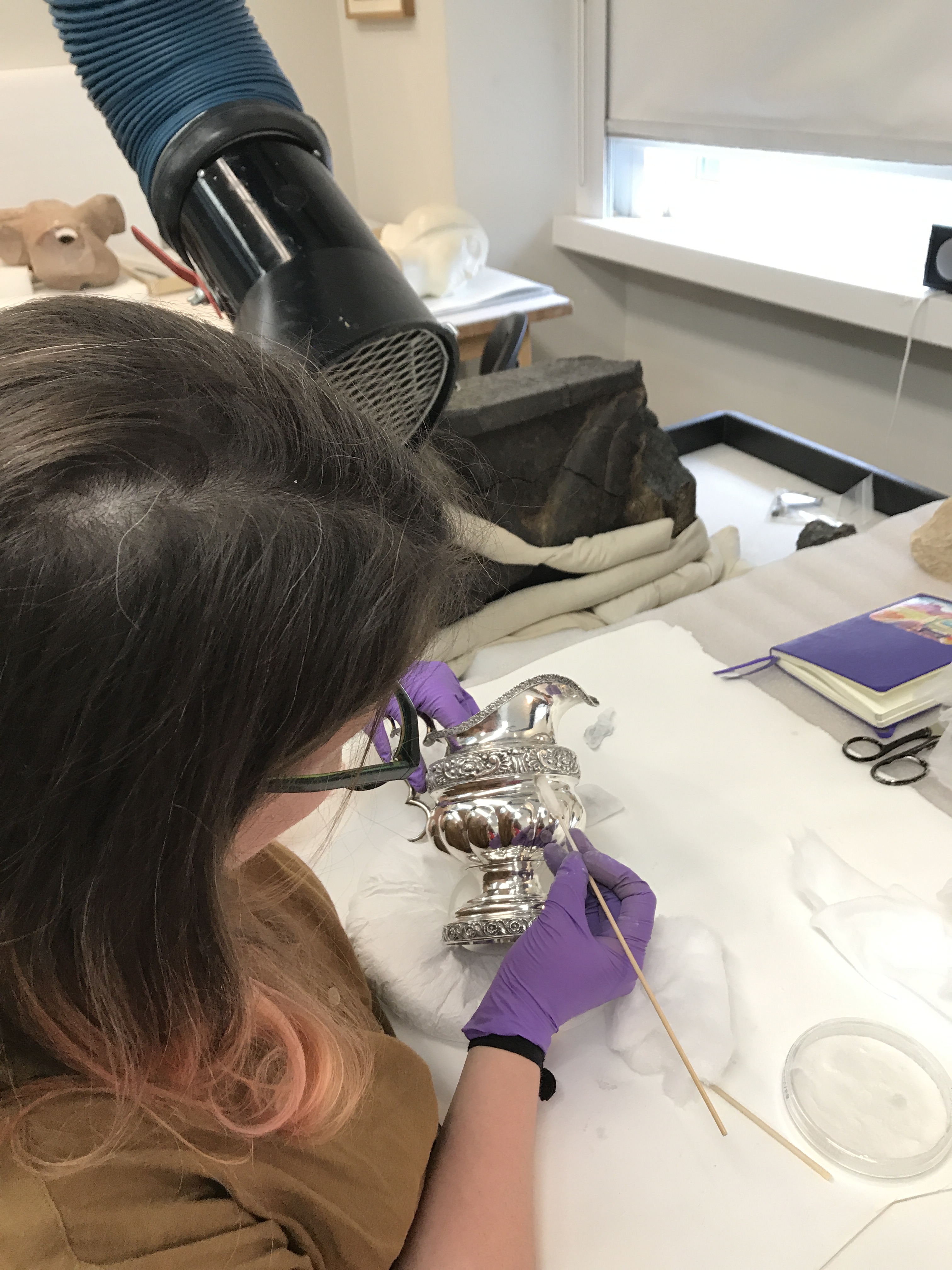 5. In between treatments, the object was sealed in a polyethylene bag with Pacific Silvercloth (a calendared cotton velvet embedded with tiny sacrificial silver particles) and Hollytex (white nonwoven polyster fibers spunbonded from a continuous filament which results in a strong, lint-free, lightweight fabric with no added binders or pigments)
